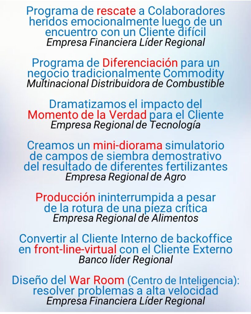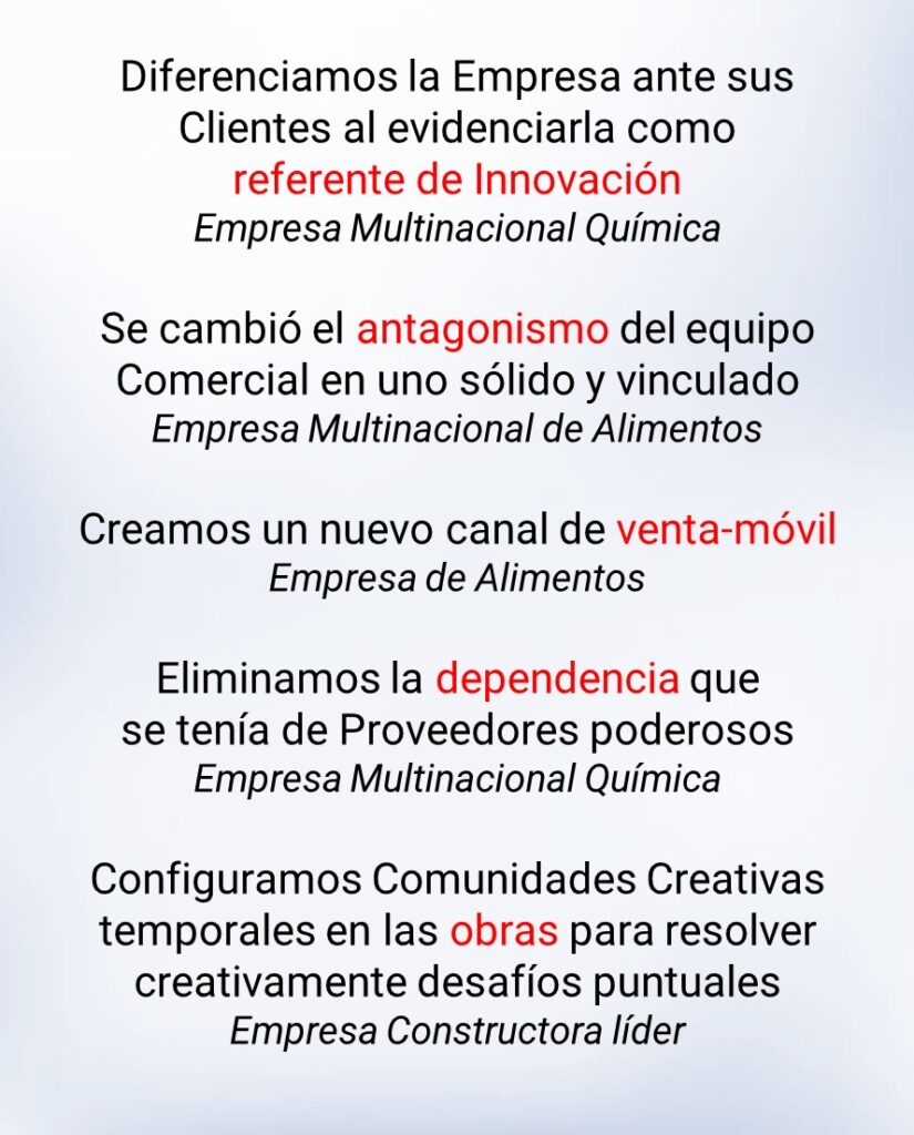 Activo desde el 2004 en Guatemala, España, Estados Unidos, México, Perú, Colombia, Panamá y Centro América, ayudando a Organizaciones Multinacionales, Regionales y Locales a incorporar el factor estratégico-creativo y el Pensamiento DIsruptivo en la Cultura Organizacional.